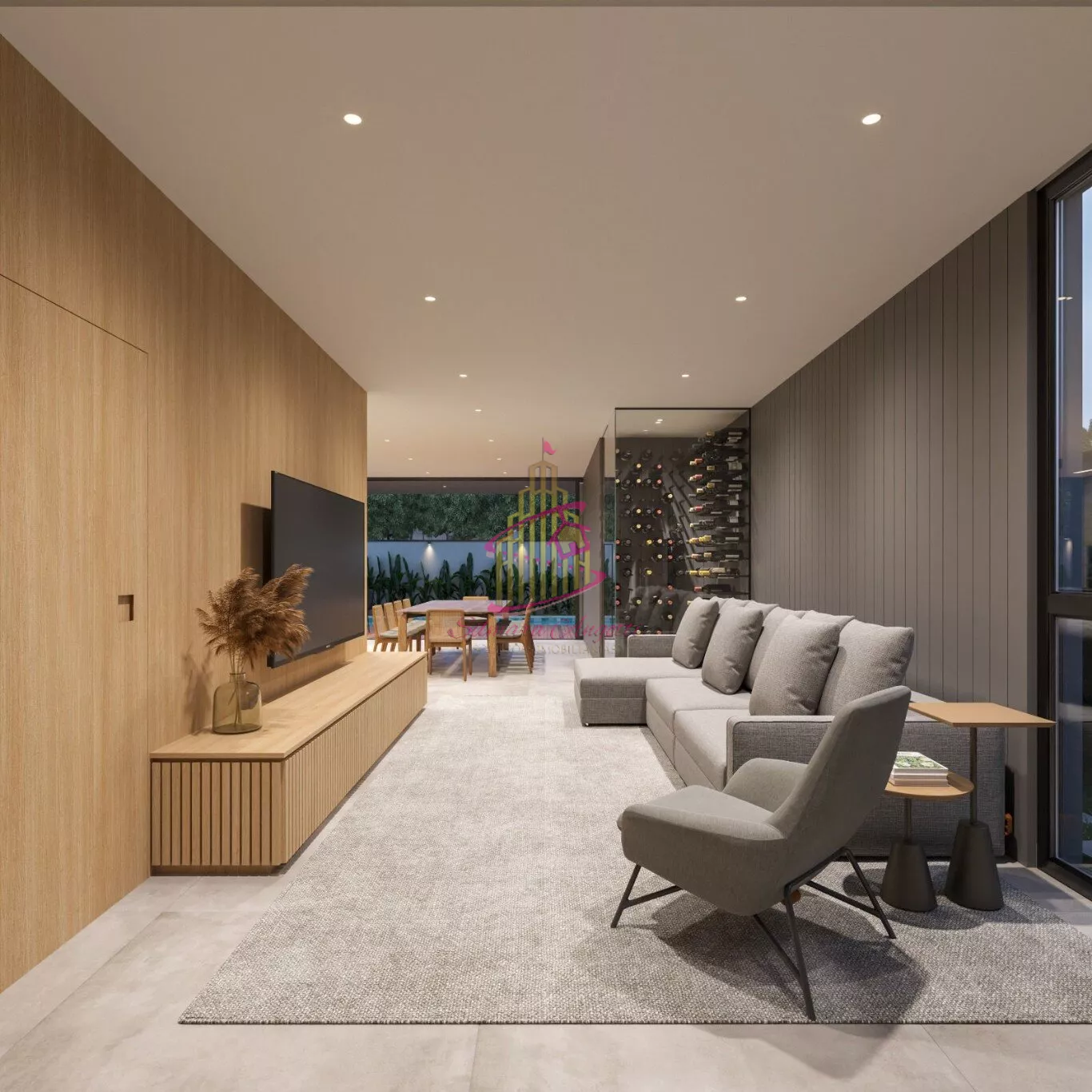Sala de tv, sala de jantar e cozinha integradas com vista para piscina