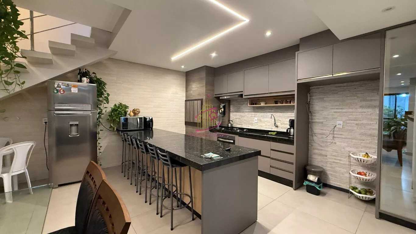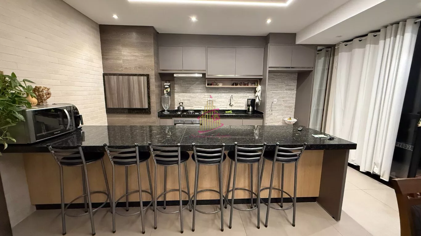 01 cozinha gourmet com churrasqueira e cristaleira , com bancada bem larga com armário planejado , sala de jantar e hall de entrada integrados