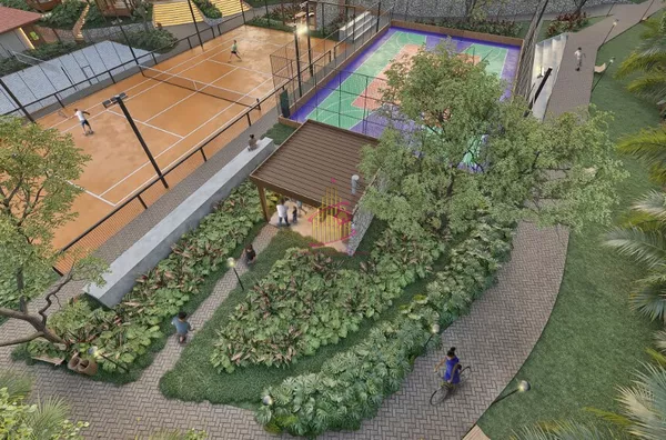 Além do complexo de serviços, com portaria, entrada de serviço, guarita, escritório, mini mercado, central de resídios e espaço entregas, e de esportes, com quiosques gourmet, quadra poliesportiva, quadra de tênis (saibro), quadra de beach tennis/futvôlei, academia ao ar livre, vestiário/banheiro e arquibancadas.